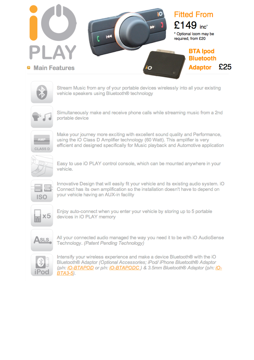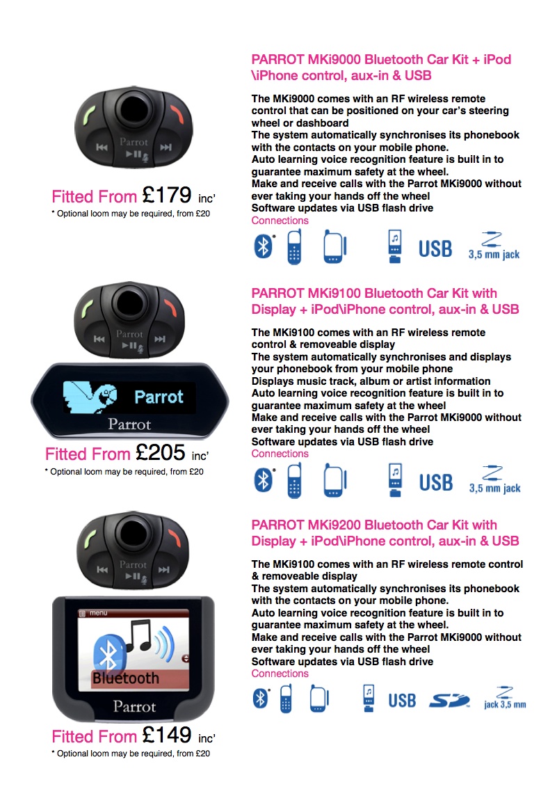 If your vehicle cannot support this type of connection, we can in many instances fit either one of Parrot’s MKi or IO’s Play range of Ipod/Bluetooth Handsfree units.